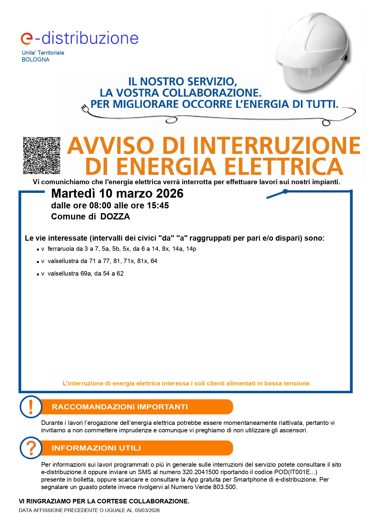 Si informa che Martedì 10 marzo 2026 dalle ore 8,00 alle ore 15,45 verrà interrotta l'energia elettrica in alcune strade del territorio per effettuare lavori sugli impianti. Le vie interessate nonchè raccomandazioni e informazioni utili sono riportate nel seguente volantino.