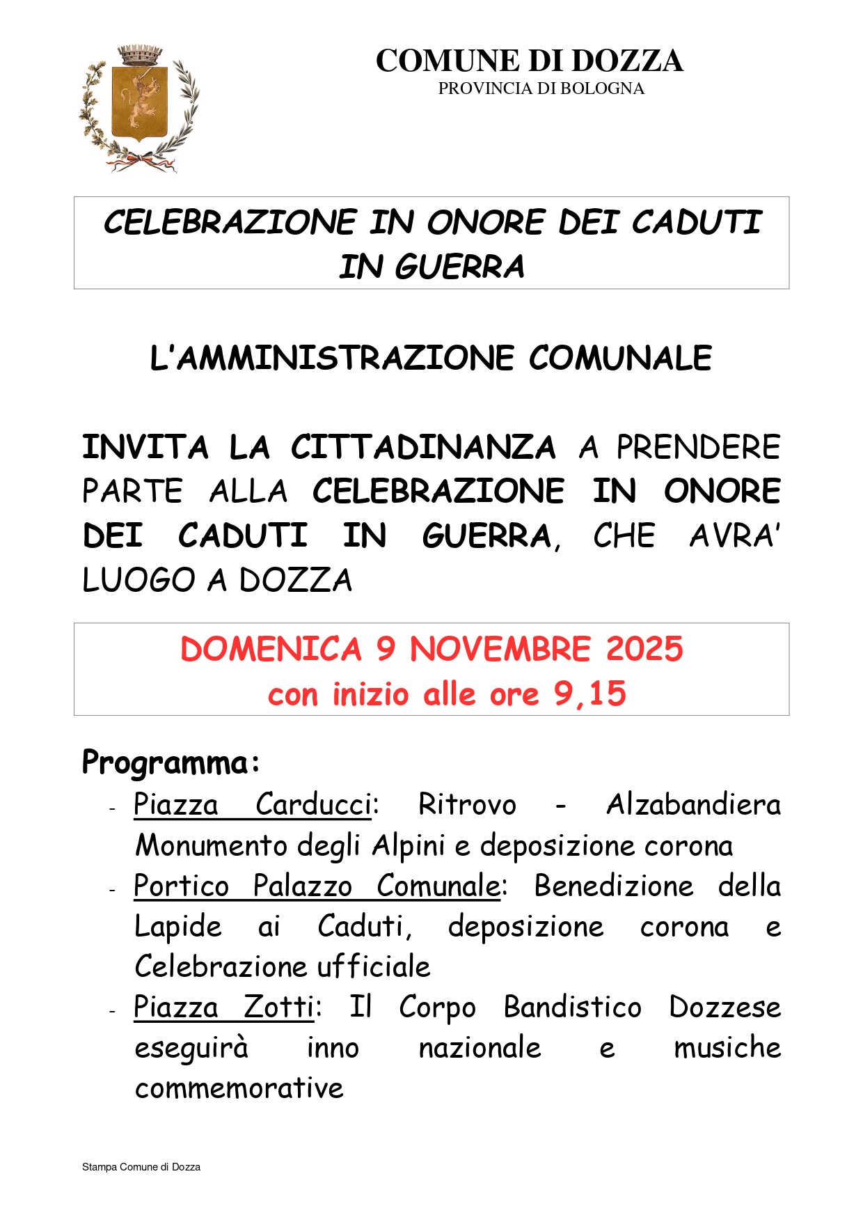 Domenica 9 novembre 2025 con inizio alle ore 9,15 si terrà la celebrazione ufficiale dell'Amministrazione Comunale in onore dei Caduti in Guerra, secondo il programma qui di seguito riportato.