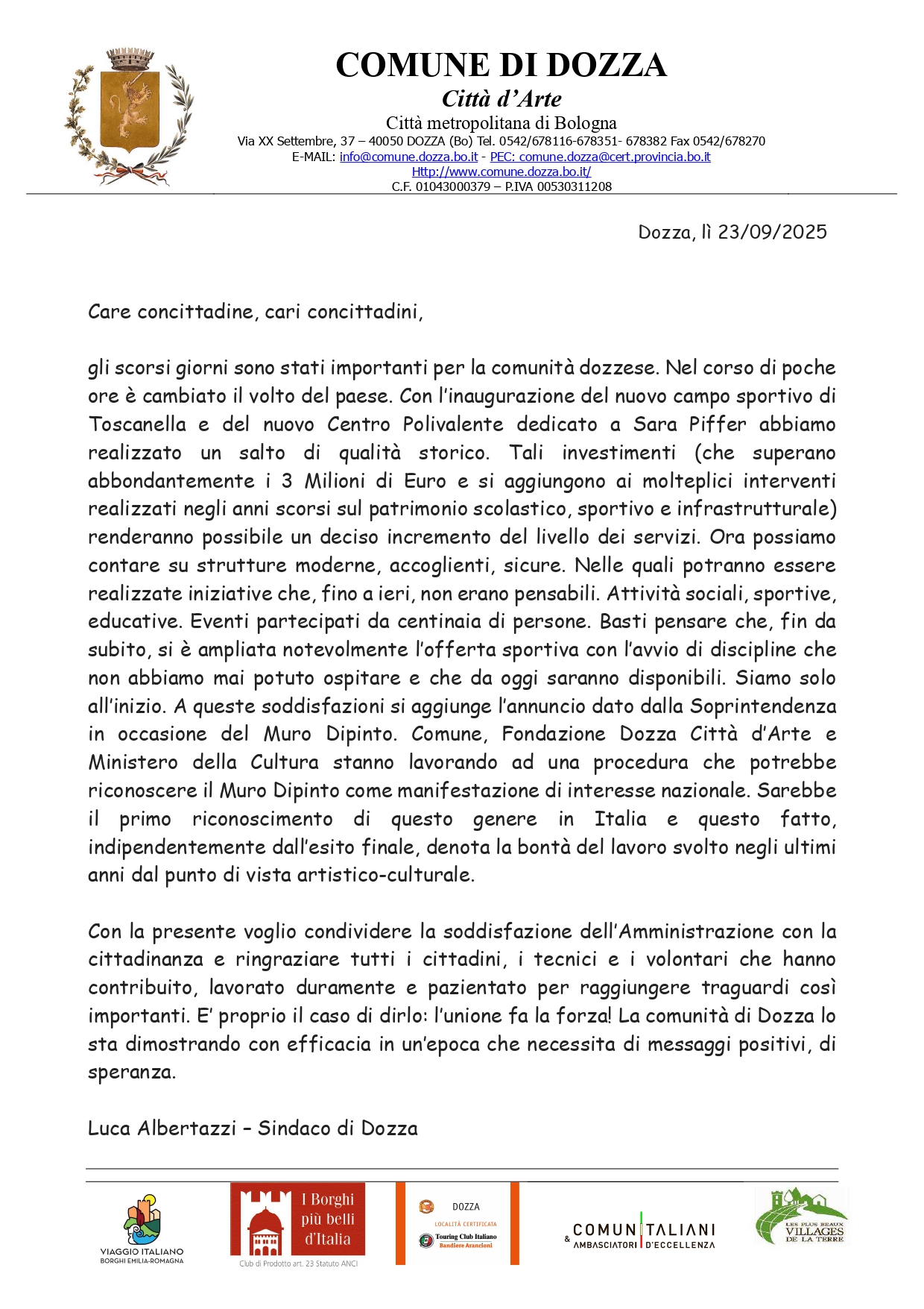 Qui di seguito il testo della lettera del Sindaco Luca Albertazzi rivolta ai cittadini: